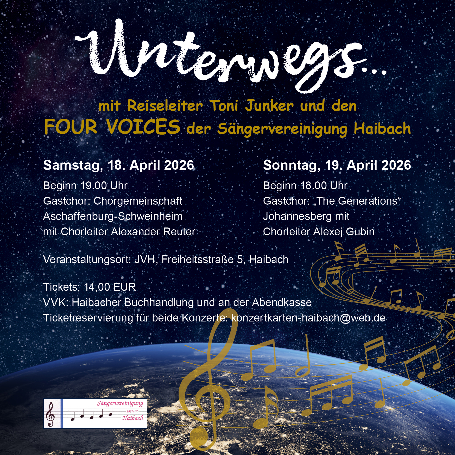 "Unterwegs" Konzert mit Four Voices am Samstag, 18. April um 19.00 Uhr und am Sonntag, 19. April um 18.00 Uhr im Jugend- und Vereinshaus Haibach.